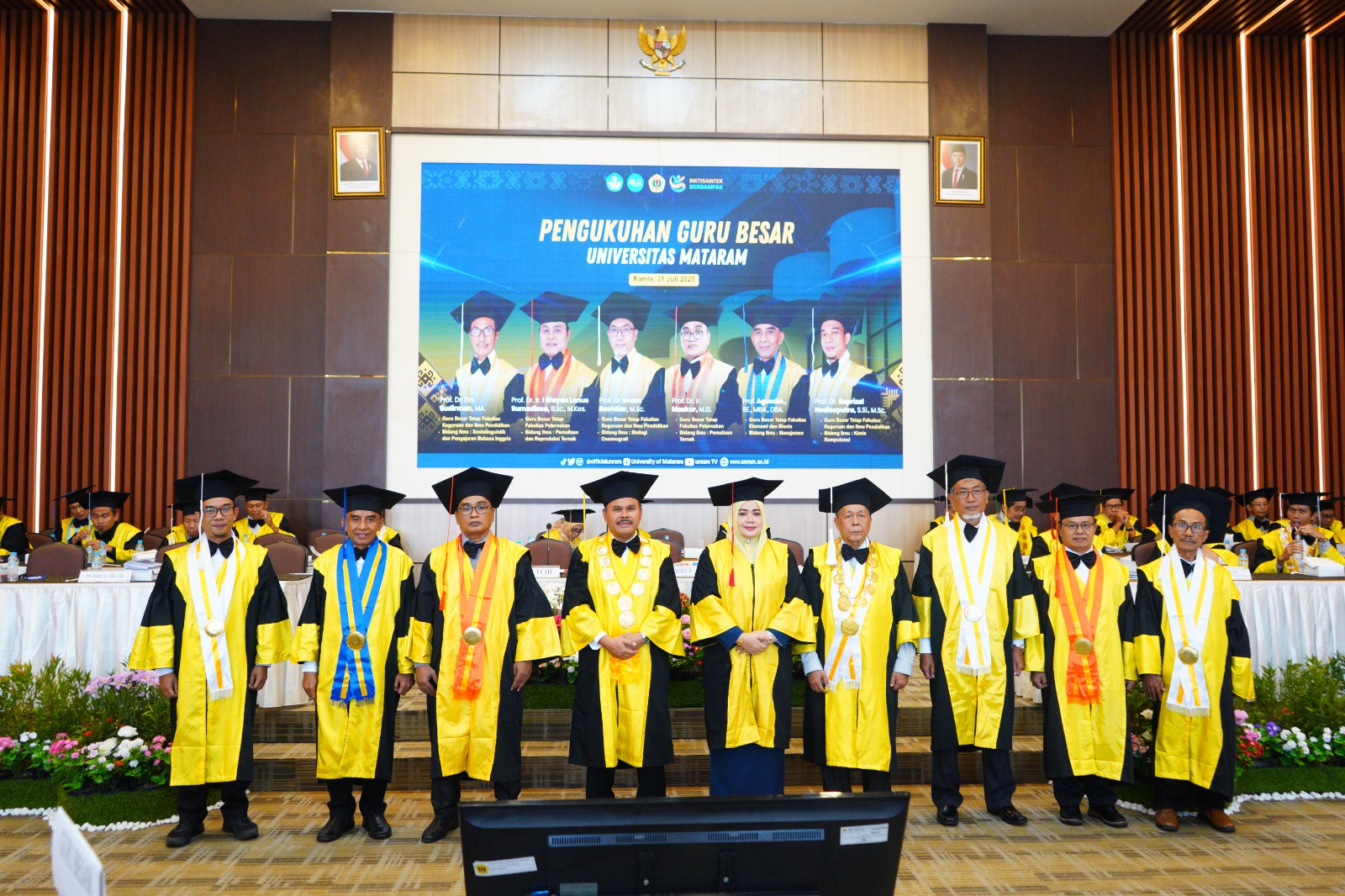 Mataram, University of Mataram – The University of Mataram officially inaugurated six new Permanent Professors on Thursday, July 31, 2025, in the Senate Conference Room at the Rectorate Building. The inauguration was led by the Rector, Prof. Ir. Bambang Hari Kusumo, M.Agr.St., Ph.D., and attended by the Vice Governor of West Nusa Tenggara Province, members of the University Senate, fellow professors, and invited guests.